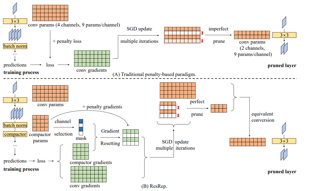 1. 解耦学习和遗忘机制的神经网络压缩方法 2021年10月,清华大学脑与认知科学研究院丁贵广团队在计算机视觉领域国际顶级会议 ICCV发表了一篇题为“ResRep: Lossless CNN Pruning via Decoupling Remembering and Forgetting”的文章,提出了一种简单高效、性能优越的神经网络压缩(剪枝)方法,显著超越现有其他方法。 神经科学研究表明,动物脑中的记忆和遗忘是两个相对独立的过程,由不同的化学物质和机制控制。现有的模型剪枝方法往往通过在训练过程中加入特殊的正则项来实现剪枝,在这一过程中“记忆”(保持精度不降低)和“遗忘”(剪掉某些结构)是耦合的,因而效果不佳。本文提出在剪枝过程中解耦“记忆”和“遗忘”,额外构造特殊结构来承载剪枝造成的负面影响,取得了显著超过其他方法的压缩效果。在常用的标准ResNet-50模型上,这一方法可以在超过50%压缩率的前提下实现精度完全不降低。 2. 深度极简卷积神经网络通用模型与结构重参数化 2021年6月,清华大学脑与认知科学研究院丁贵广团队在计算机视觉领域国际顶级会议 CVPR发表了一篇题为“RepVGG: Making VGG-Style ConvNets Great Again”的文章,提出了一种极简、高效、对定制人工智能芯片非常友好的卷积网络通用模型(RepVGG)。 现有实用卷积神经网络架构(如ResNet、RegNet)多为多分支架构,结构复杂,并行度低,速度慢,内存利用率低。虽然经典的单路架构(如VGG-16)具有结构简单、并行度高、速度快、内存利用率高的特点,但是性能(精度)显著低于多分支架构,所以不实用。本文提出一种推理时单路径的卷积神经网络(称为RepVGG)和一种“结构重参数化”方法。这一方法可以将训练时的多分支架构与推理时的单路架构解耦:训练时的模型有多条分支,但在训练完成后将其通过结构重参数化方法等价转换为单分支的推理时模型。这一方法使得单路架构卷积神经网络性能比多分支网络更好或相当,又同时具有推理时结构简单、并行度高、速度快、内存利用率高的特点。 (原文链接https://it.sohu.com/a/525206879_121119002)