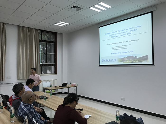 8月30日上午,在北校区主楼三区第三会议室,首先,秦家虎教授作了“Distributed k-Means Algorithm and Fuzzy c-Means Algorithm for Sensor Networks Based on Multi-agent Consensus Theory”的学术讲座,报告会由XCSport自控系主任张强教授主持,来自XC体育60余人参加了学术报告会。报告中,秦家虎教授首先介绍了传感器网络系统分布式控制的基本问题,对传感器网络动态、拓扑结构、分布式协议等进行了详细的介绍。重点介绍了传感器网络的分布式K-均值和模糊K-均值算法研究,其中包括问题的提出和建模、聚类定义和中心质点以及更规则等。最后介绍了将来的研究热点和发展趋势。秦家虎教授的报告内容既具有理论上的创新性又紧贴实际工程应用,引起了广大听众的共鸣。最后秦教授现场与广大师生进行了热烈的交流和讨论,他详细解答了每一个提出的问题,到场师生表示受益匪浅。