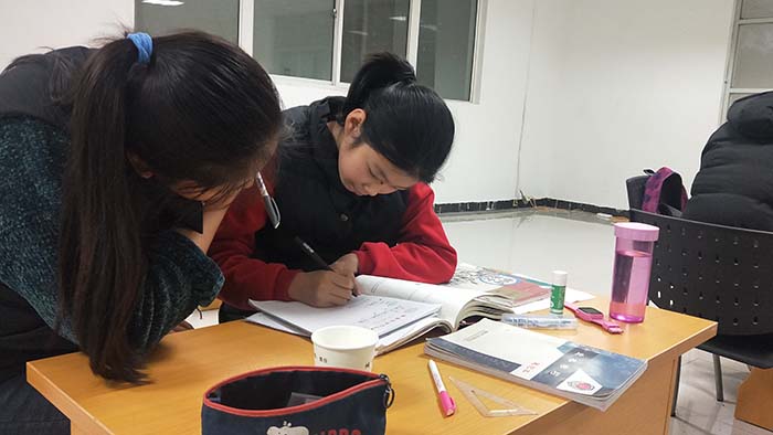 阿姨们下午两点上班,把孩子们带到公司来,她们工作时志愿者们便开始功课辅导活动。志愿者们先把桌椅按孩子们的年级分成不同的区域,确保每一个孩子身旁都有志愿者在辅导功课,又彼此不会相互打扰,然后开始对孩子们进行课业辅导。