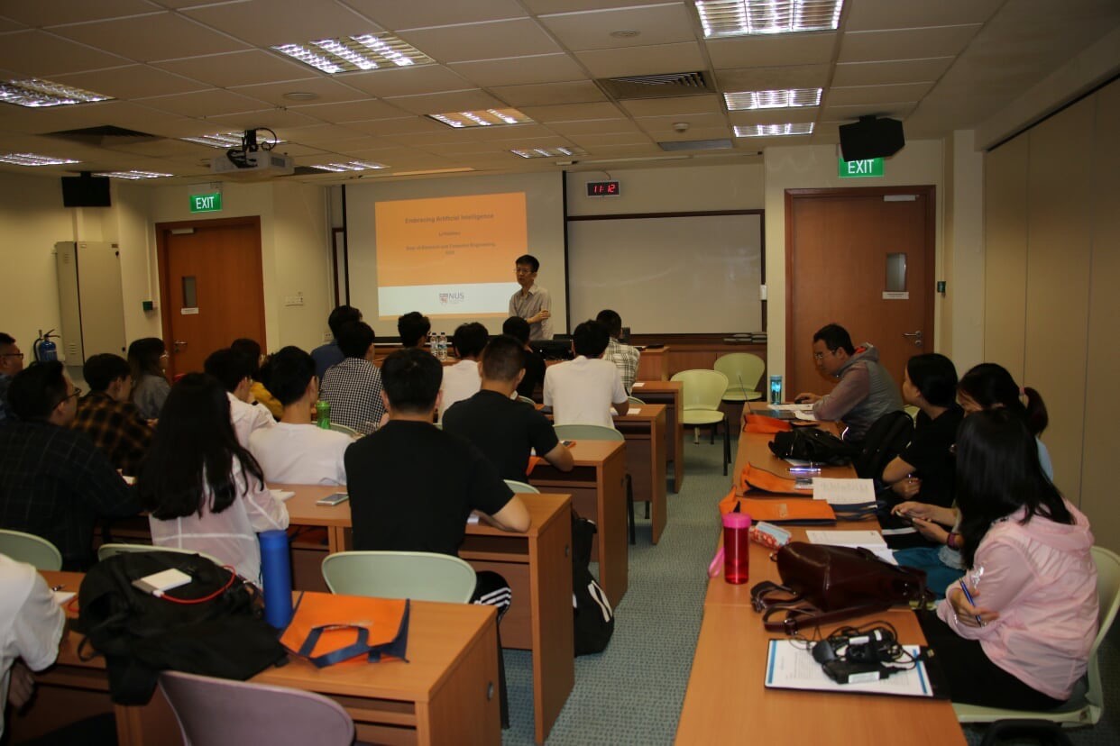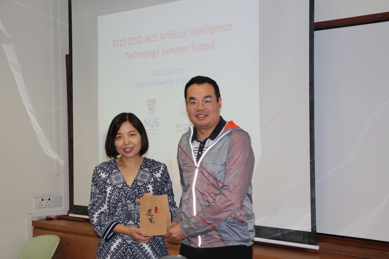 开营仪式由Zhang Rongli博士主持。张博士从活动安排、新加坡国情概况、教育体制和NUS介绍等方面向同学们做了讲解,拉开了智能机器人技术训练营的序幕,让同学对丰富的讲座和体验活动充满了期待。随后,XCSport王飞老师向NUS张老师和李海洲教授赠送西电定制礼物,双方合影留念。随后,李海洲教授以人工智能的相关背景与发展以及语音处理的相关技术为题目,为同学们做了一场精彩的报告。