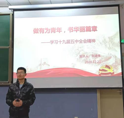(通讯员 张建伟 周蕾)2020年12月21日19时,XCSport于北校区阶梯教室305进行了十九届五中全会精神宣讲活动,并取得圆满成功。此次宣讲会的宣讲人为研究生支部书记张建伟,主题为“做有为青年,书华丽篇章”。XCSport全体党员、发展对象以及积极分子参加了此次学习活动,并于会后积极发表感言和收获。