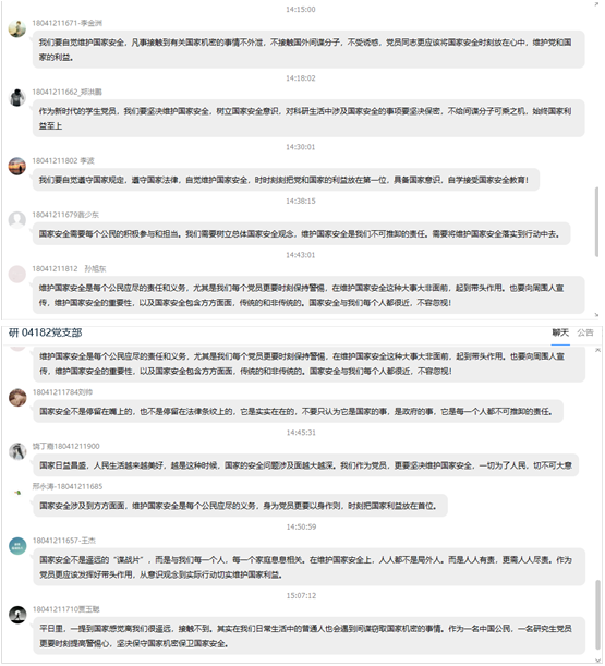 最后支部书记蔡一凡同志总结并谈论自己的想法:人人安全,国家有责;国家安全,人人有责。在维护国家安全上,人人都不是局外人、旁观者,而是人人有责,更需人人尽责。现在,疫情还没有结束,“内防反弹、外防输入”的任务仍然很重,还需要上下齐心,同舟共济。作为研究生党员我们更要正确把握当前国家安全形势,提升国家安全意识,自觉维护国家安全,为实现“两个一百年”奋斗目标、实现中华民族伟大复兴的中国梦提供牢靠安全保障。