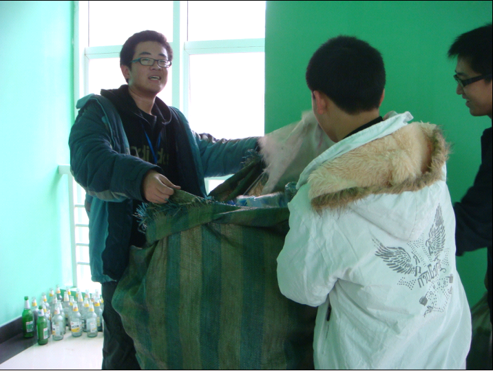 本次活动持续了近四个小时,虽然室外气温很低,各类废瓶散发着种种腐臭,许多同学手都冻得发红,但他们依旧在室外将收集到的瓶子分类,脸上洋溢着灿烂的笑容。