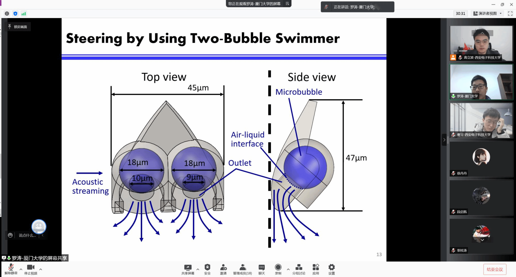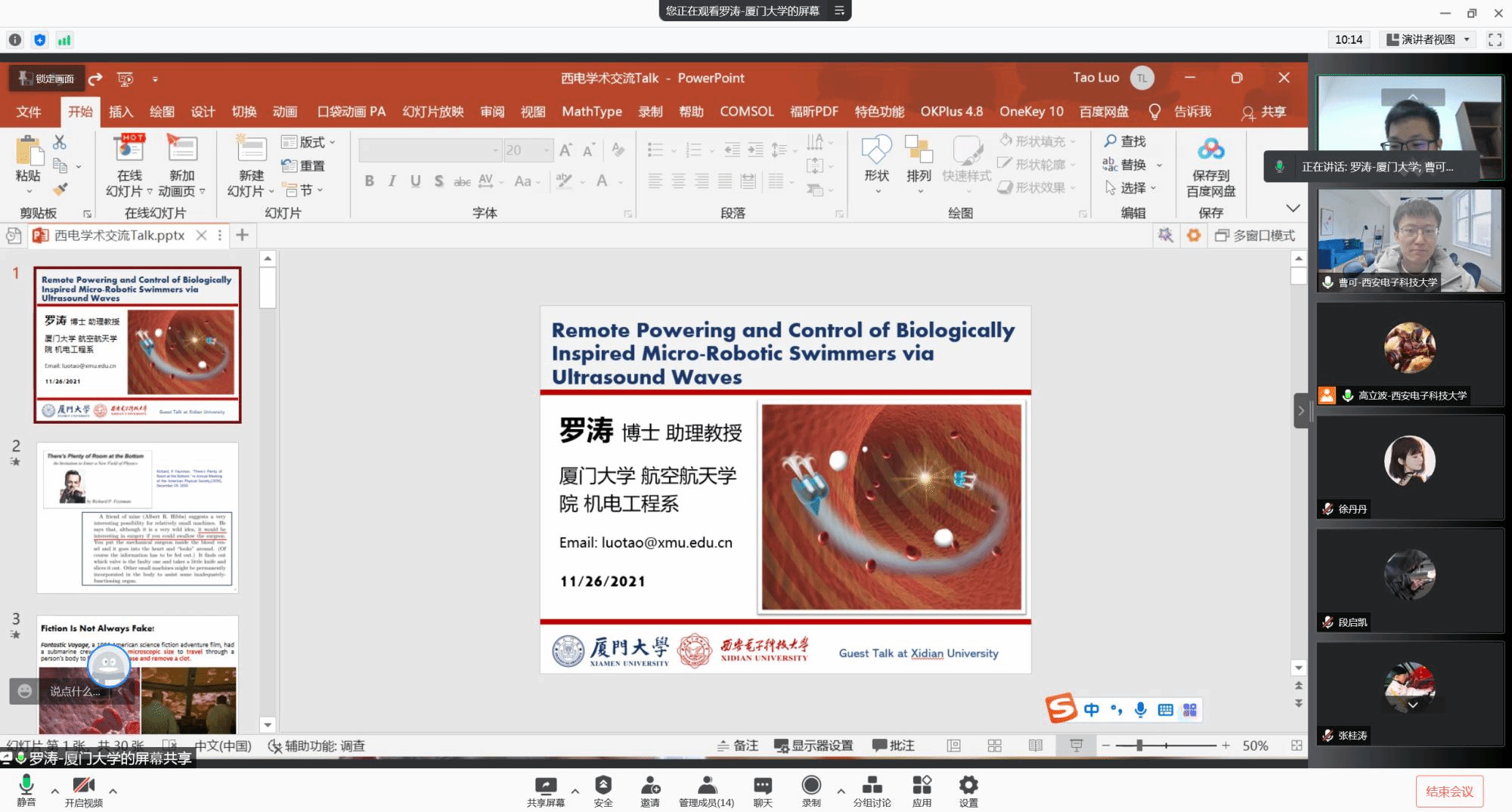 (通讯员 高立波)11月26日上午,应XCSport高立波的邀请,厦门大学航空航天公司机电工程系助理教授应邀在线上作了题为《Remote Powering and Control of Biologically Inspired Micro-Robotic Swimmers via Ultrasound Waves》的学术报告。本次报告因疫情原因改为线上,高立波,王明智,曹可等测控系师生参加,高立波副教授主持。
