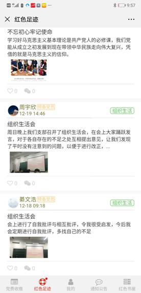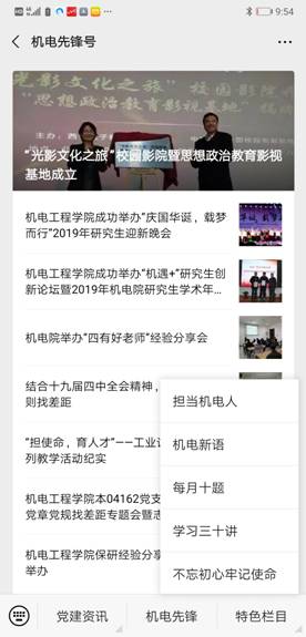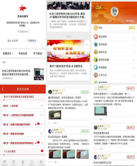 5.利用信息化手段促进基层党组织建设效率提升。依托公司党建微信公众平台“机电先锋号”搭载的“一云台两专栏四推送”---即“党建云”智慧管理系统平台,“党建资讯”、“特色栏目”两个专栏将党章党纪党规和专题教育的相关内容融于其中以及每月推送四次党建要闻宣传党的政策、传达上级精神、交流“不忘初心、牢记使命”主题教育的工作经验。特别是通过“机电先锋”党建云智慧管理系统平台大大提高了基层党组织的工作效率:通过“党费收缴”实现党费一键“秒交”,每月按时交党费,永远不忘共产党员身份;通过“红色足迹”方便分享党员个体的学习体会和成长经历,拉近了心与心的距离;通过“通知公告”把中央要求、上级文件、工作安排轻松放到每个党员口袋里;通过“红色书屋”把成千上万本理论书籍摆到大家面前,网上下单分分钟送到;会议通知、电子签到、党务公开、组织建设一个个功能真正做到整合资源、充实数据、科学运用、优化机制,营造“红色空间”党建氛围,切实提升了公司基层党建工作的质量。今年主题教育以来为解决党员发展中的规范化问题我们新上线“党员发展”模块将党员发展的“五大步25小步”融入系统实现线上线下党员发展全流程辅导,全过程纪录。公司《打造“智慧党建”创新平台,提高基层党建工作水平——以“机电先锋号”创新平台建设为例》也荣获了校十佳党建特色案例。