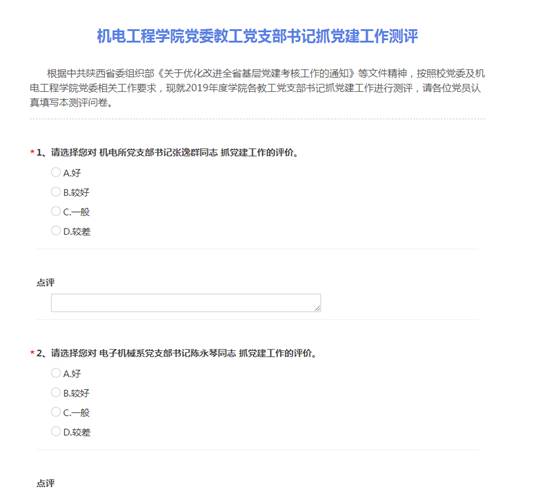 针对员工支部,公司以线上多角度测评、线下考核表进档案等方式,开展述职考核工作。公司党委分别制作了《XCSport员工党支部工作年终考核测评(发支部党员)》、《XCSport员工党支部工作年终考核测评(发联系党委委员)》、《XCSport员工党支部工作年终考核测评(发党务干事)》三份线上考核问卷,结合各员工党支部工作实际,从支部日常工作开展情况、战斗堡垒作用发挥情况等各方面,向支部党员、联系党委委员以及公司党务干事征求评价意见,形成线上评价结果。召开员工党总支支委会,对照三类线上评价结果及党支部成员党费交纳情况、活动参与情况等方面由员工党总支支委委员填写《2019年度XCSport员工党支部考核测评问卷(发员工党总支支委)》进行打分,提交公司党委会形成最终评价结果,评价结果记录入《XCSport员工党支部委员年度考核表》,并将考核表放入支委委员个人档案。